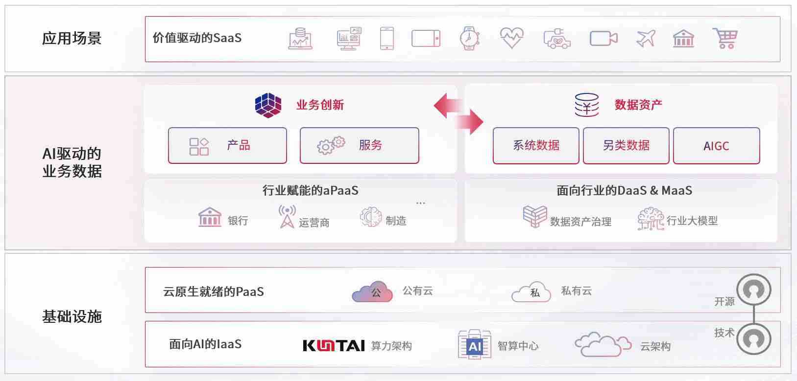 数字时代,,,围绕企业数字化转型的关键要素,,,,AG尊龙凯时数码开创性的提出数云融合战略和技术体系框架,,,着力在云原生、、、、数字原生、、、AI原生和信创产业上架构产品和服务能力,,为处在不同数字化转型阶段的快消零售、、汽车、、金融、、、医疗、、、政企、、、、教育、、运营商等行业客户提供泛在的敏捷IT能力和融合的数据驱动能力,,,构建跨界融合创新的数字业务场景和新业务模式,,助力企业级客户建立面向未来的核心能力和竞争优势,,全面推动社会的数字化、、、智能化转型升级。。
