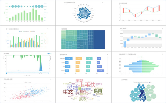 - 数十种的可视化图表效果,,包括柱形图、、、、折线图、、、雷达图、、、、散点图和词云图等,,,,满足不同人群的阅读偏好,,,为您展示多样数据信息提供全面支持