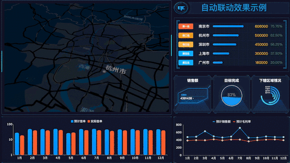 - 支持业务互动,,包括不限层次的钻取、、多维度的联动分析、、、轮播时自动联动其他组件等,,协助您更好的发现并分析业务问题
