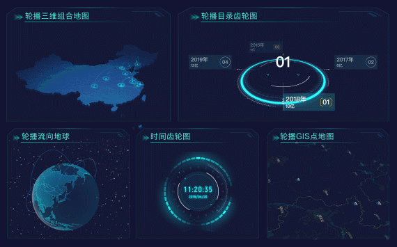 - 我们基于webgl等技术开发了大屏图表插件,,通过简单拖拽即可实现自动播放、、3D动画特效等多种效果;图表类型包括轮播三维组合地图、、轮播gis点地图、、流向地球、、、、时间齿轮和目录齿轮等,,科技感十足,,,让大屏展示效果更加炫酷