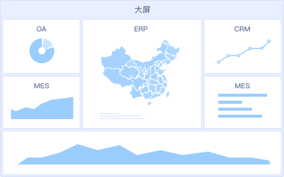 - 同一个大屏看板可以轻松整合ERP/OA/MES等多业务系统的数据,,,,打破信息孤岛,,,,进行综合展示分析,,,,让决策更清晰