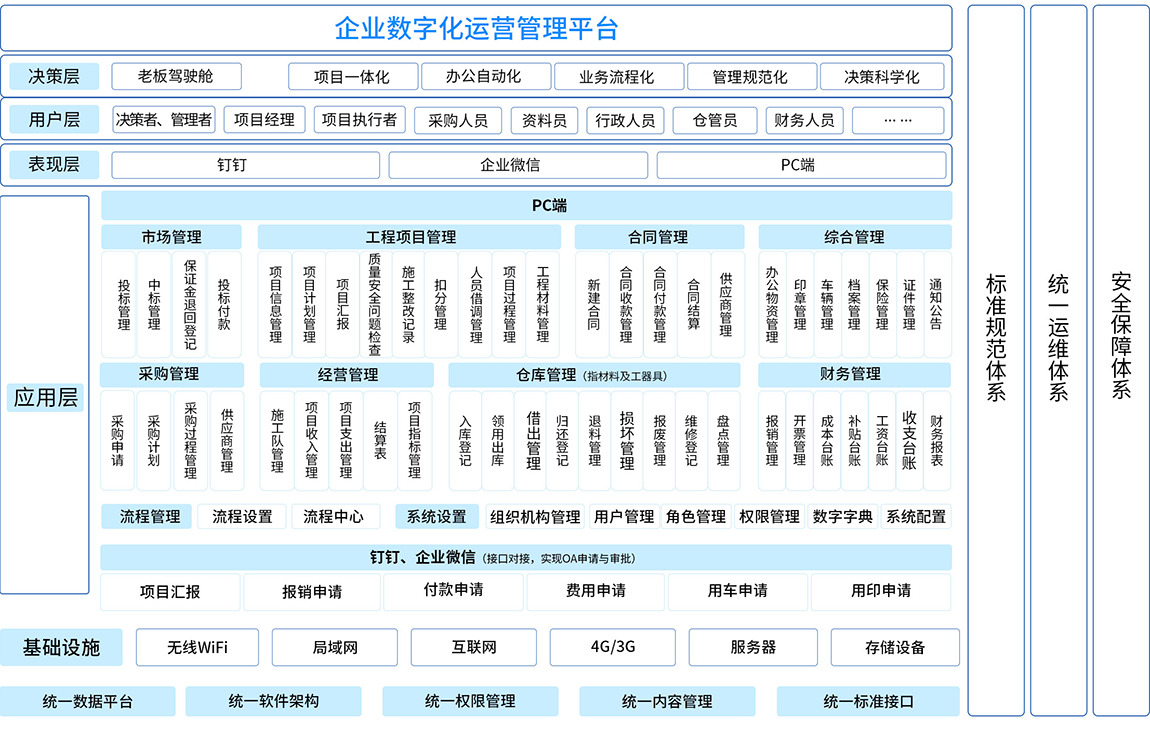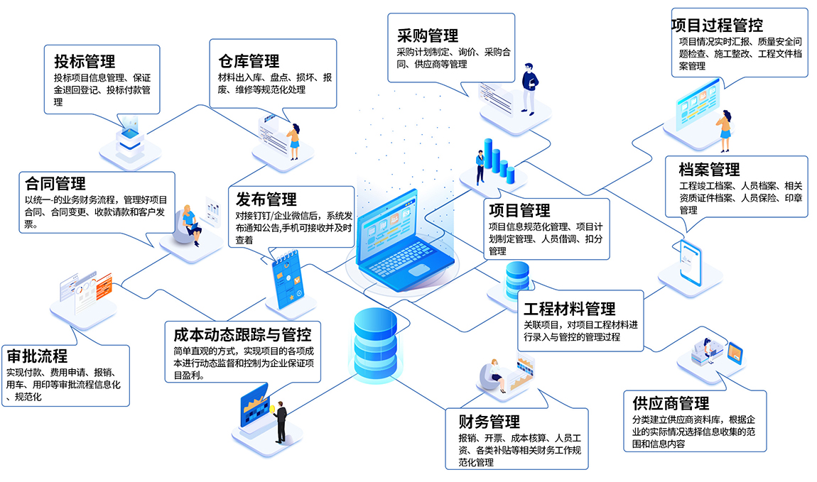 数字化管理系统对企业工程项目从项目投标中标、、、项目过程管理、、、合同管理、、、物资设备管理、、采购管理、、项目过程管理、、、施工队管理、、、供应商、、成本核算等进行全面综合管理;纵向贯穿投标、、、采购、、、施工、、、、竣工的全过程,,,,横向涉及公司内部的各相关岗位,,,,是一套全方位、、、集成的企业项目综合管理平台。。。通过对成本、、、进度、、质量、、、安全等方面的控制,,以及对合同、、结算、、、支付、、资金等要素的管理,,,,来提高工程类企业对工程项目的综合配套能力。。。。