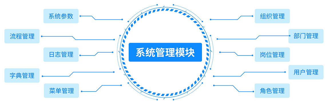 系统管理模块提供各项基础参数配置,,用于支撑系统人员层级的管理和人员权限的控制以及离散属性的配置如各项阀值等。。包含组织管理、、部门管理、、、、岗位管理、、角色管理、、、、用户管理、、菜单管理、、字典管理、、、、日志管理、、、系统参数、、、、流程管理。。